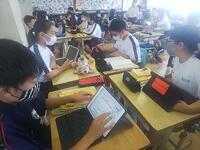 7月20日(水)、1年生の保健授業です。単元は睡眠です。教師は生徒一人一人の考えを把握し、生徒はタブレットを使ったり、ワークを使ったりと選んで学習します。