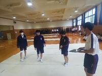 9月6日(火)、3年生の保体授業はチームによる新体操です。チームで動きを企画し、実際に広々したマット上で合わせます。オンラインで入っている生徒もいます。