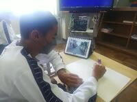 9月5日(月)、特別支援学級の授業、全クラス、毛筆です。気を落ち着けて、指、腕、肩の動きに集中します。