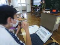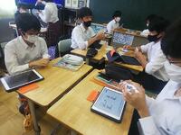 10月13日(木)、2年生の国語授業です。教材は短歌、グループで表現の仕方を共有画面で話し合いです。