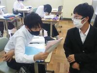 10月13日(木)、2年生の数学授業です。教材は1次関数、生徒同士で教え合いをしています。