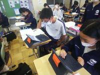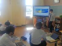 10月13日(木)、2年生の国語授業です。教材は短歌、グループで表現の仕方を共有画面で話し合いです。