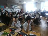 10月25日(火)、3年高校説明会、私立、公立の高校の先生方がいらしての説明会です。高校生活に興味津々、真剣に話を聞きます。
