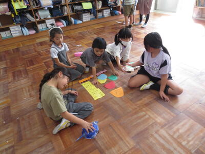 2年生が生活科の授業で、うごくおもちゃづくりにチャレンジしました。自分たちが工夫して作ったおもちゃを友達に体験してもらいます。お店番も上手です。