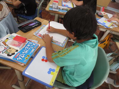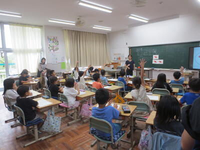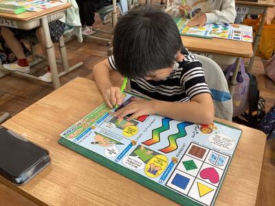 静かに先生の話を聞いて、算数の学習をしていました。かけ算の学習は、2年生の山場です。一生懸命さが伝わってきました。