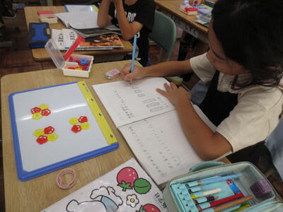 2年生算数の授業では、かけざんの学習をしています。授業では、おはじきをつかって考えたり、自分の考えをノートに図で表現したりしています。