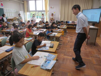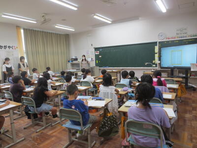 2年生が算数の授業で、「水のかさ」の学習活動を行っています。目を輝かせながら取り組んでいます。ノートにしっかりと良い姿勢で書くことができる2年生、とても立派です。