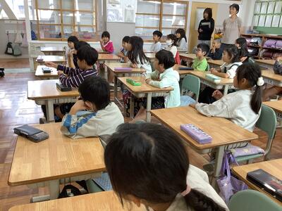 2年生音楽の授業です。「音の重なりやリズムをえらんで合わせよう」の学習課題で、友達と楽しみながら活動しています。