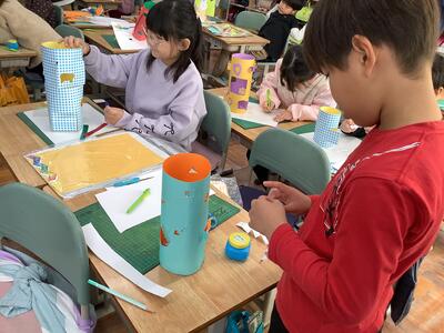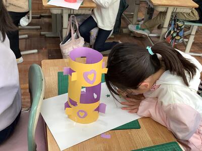 2年生図工の授業では、カッターを使って、作品づくりです。「窓をあけたら」の題材で、子供たちがアイデアいっぱいの作品をつくっています。