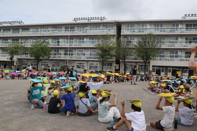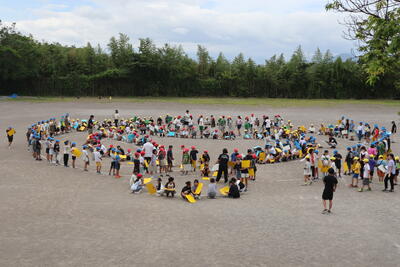 23日(月)の午前、全校児童と職員で、開校50周年記念の写真撮影を行いました。2時間目には運動場で、向山小学校の校章に虹が架かったデザインを、全校児童と職員であらわしました。撮影はドローンで行われ、子どもたちも大喜びでした。また、全校児童の集合写真も撮影しました。