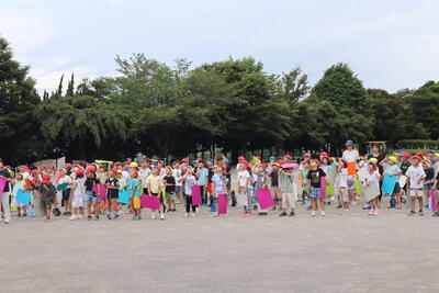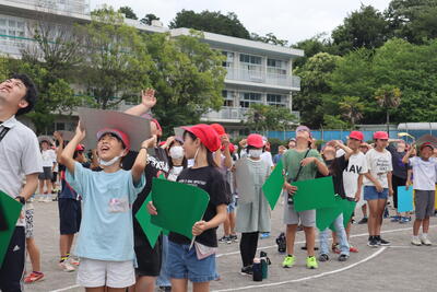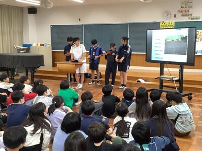 最後に、向山小の校歌を全校で歌いました。3年生の代表児童が、どうやって向山小の校歌でできたのか、調べたことを発表してくれました。子供たちの元気いっぱいで、すてきな歌声が、体育館いっぱいに響き渡りました。
