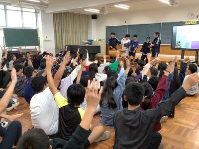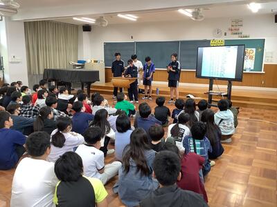 錦田中学校の良さを伝えようと、中学生のお兄さんのお姉さんたちが授業をしてくれました。「プールがないよ。」「給食はおかわりできるよ。」などの話に、うなずいたり、良かったと声を上げたりする6年生の様子が見られました。中学に行くことがまた一つ楽しみになりました。