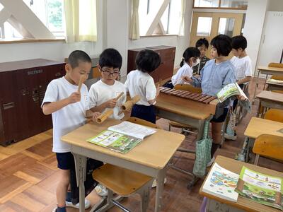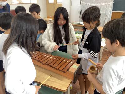 2年生音楽の授業です。「音の重なりやリズムをえらんで合わせよう」の学習課題で、友達と楽しみながら活動しています。