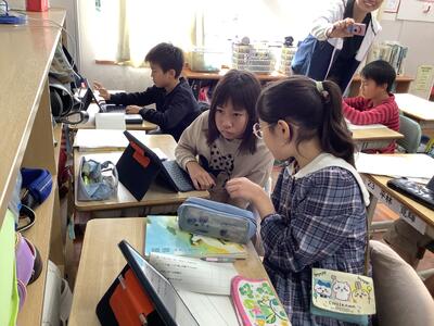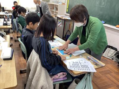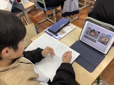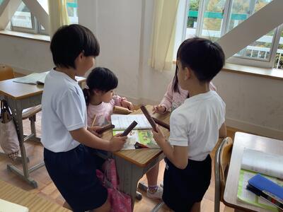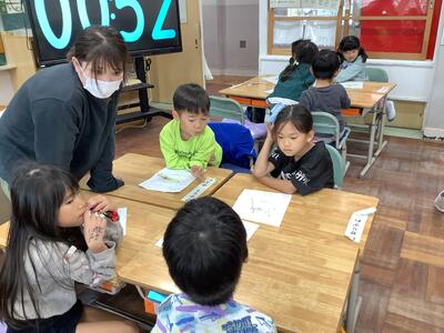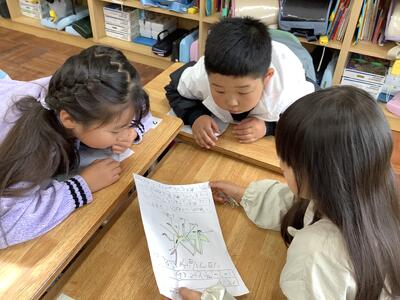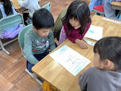 1年生活科の授業では、友達に観察カードの内容を紹介し合う活動をしていました。1年生の子供たち、生き物の様子をよく見て、感じて、絵と文で表現できています。