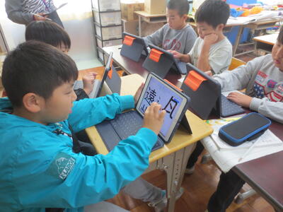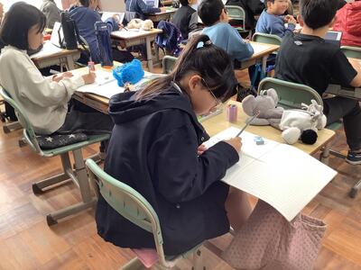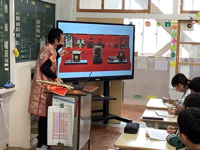 4年国語の授業の様子です。「未来につなぐ工芸品」の学習活動で、今日は、ゲストティーチャーとして用務員さんにお願いし、伝統工芸について、学びました。30年以上、人形店のお仕事をしていた経験から、雛人形や兜、鯉のぼりなど、お話を聞きました。子供たちは、真剣にメモをとったり、質問をしたりしていました。