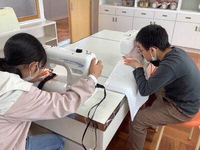 6年生家庭科の授業では、ミシンをつかって、ナップザックづくりにチャレンジです。糸の始末もミシンの使い方も上手です。出来上がりが楽しみですね。