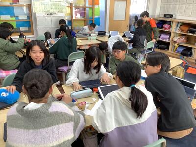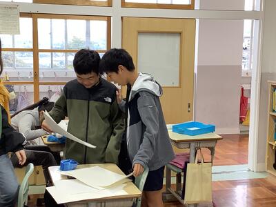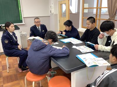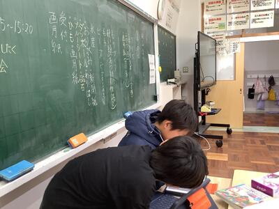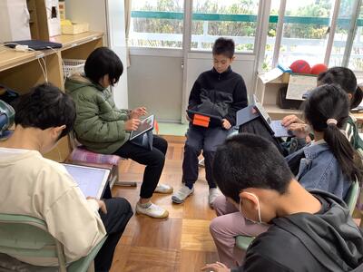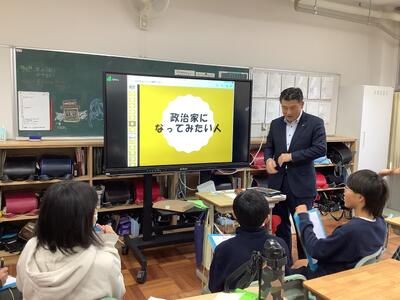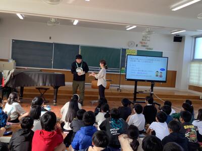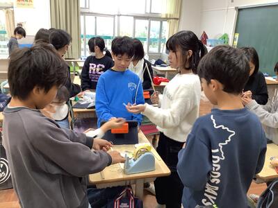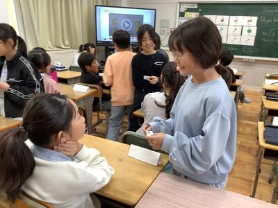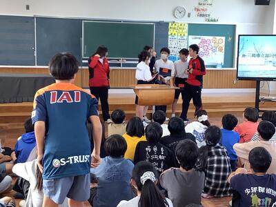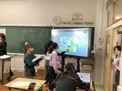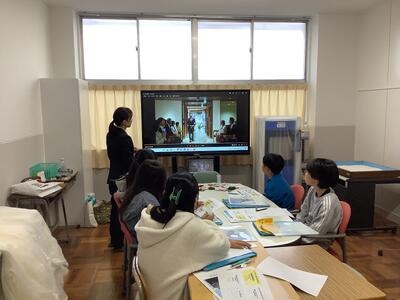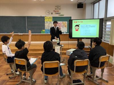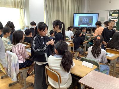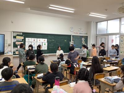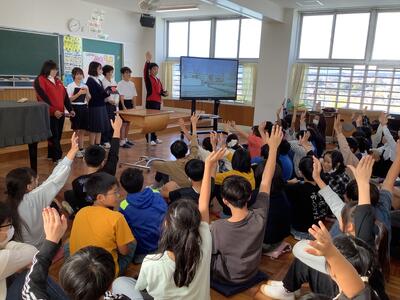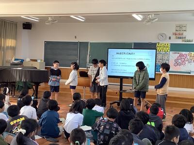 錦田中学校の良さを伝えようと、中学生のお兄さんのお姉さんたちが授業をしてくれました。「プールがないよ。」「給食はおかわりできるよ。」などの話に、うなずいたり、良かったと声を上げたりする6年生の様子が見られました。中学に行くことがまた一つ楽しみになりました。