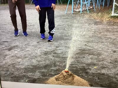 コーラを使った火山の噴火実験をもとに、風向きや地層によってどのように噴火するのかを話し合っていました。