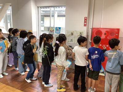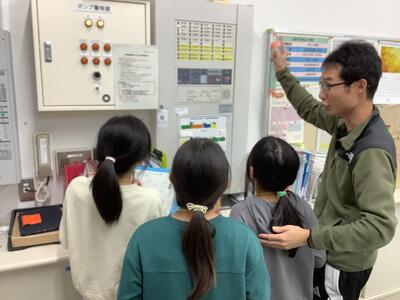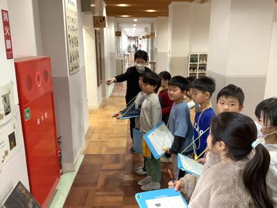 火事からくらしを守る仕組みを学習している3年生。学校にはどんな設備があるか探していました。こんなシステムがあるんだーと驚いていました。
