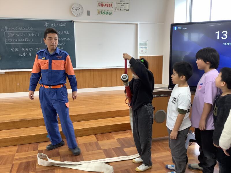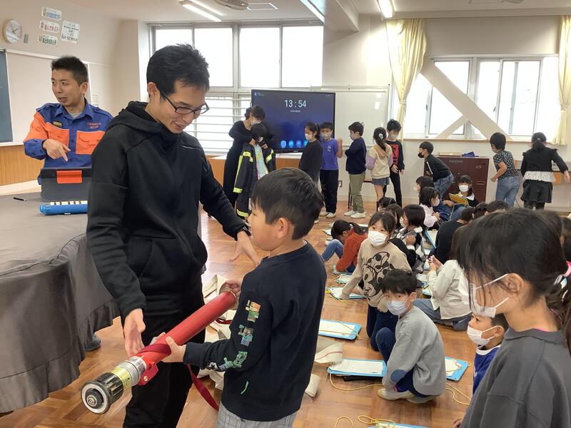 実際に、使用している防火服やホースにも触れることができ、「思っていたよりも重い!」「これを着けて動くのは大変そう」と気付く子もいました。