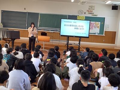 3時間目に5年生が学校保健委員会の授業を行いました。「自分の意見を言い合える仲間になろう」をテーマに、スクールカウンセラーの先生から、アサーションのメリット、コミュニケーションのタイプから、自分の意見を上手に伝える方法について、教えていただきました。ロールプレイを通して、コミュニケーションの大切さ、自分や友達の思いや意見を大切にする会話の仕方などについて、体験をしたり考えたりする時間になりました。これからの生活に役立てていけそうですね。