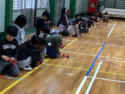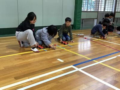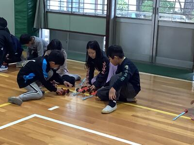 3年生理科の授業では、「ゴムのはたらき」について学習を進めています。体育館で車をつかって試しながら、ゴムのはたらきについて考えていきます。