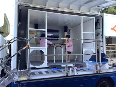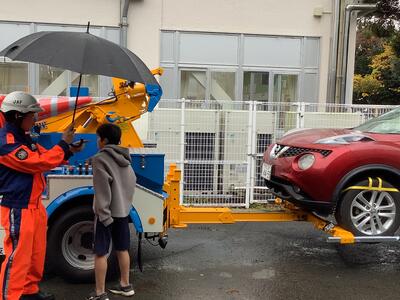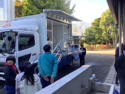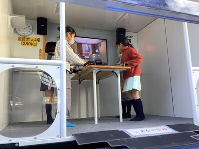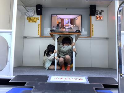 1年生と3年生が、起震車体験を行いました。実際に地震の揺れを体験することで、大きな地震が起きたときに、落ち着いて行動することができます。