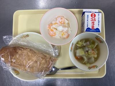給食室の大きな釜でパンを揚げて、きなこと砂糖をつけました。