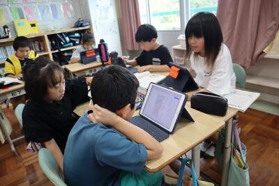 国語の授業では、子供たちがグループで学習を進めていました。自分の考えたり、友達と一緒に考えたりしながら、取り組んでいます。