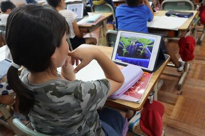 理科の授業の様子です。子供たちはホウセンカの様子をタブレット端末で写真に撮ってワークシートに貼ったり、生長の様子で気がついたことを自分の言葉で伝えたりしています。