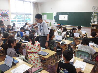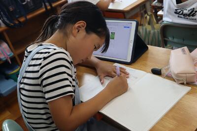 1年生が生活科で育てているアサガオをタブレット端末で撮影して、写真のデータを貼り付ける活動をできるようになりました。いろいろなことができるようになっている1年生です。