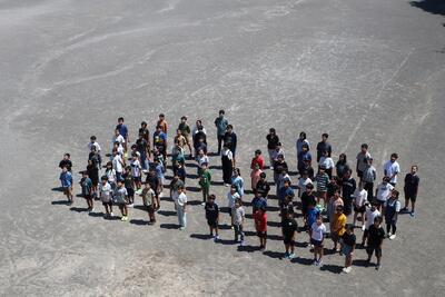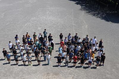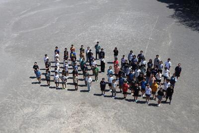 23日(月)の午前、全校児童と職員で、開校50周年記念の写真撮影を行いました。2時間目には運動場で、向山小学校の校章に虹が架かったデザインを、全校児童と職員であらわしました。撮影はドローンで行われ、子どもたちも大喜びでした。また、全校児童の集合写真も撮影しました。