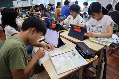 3年生国語の授業では、物語文を読み取り、場面分けをしたり、文章表現を読み取り、場面の内容を比較したりして、学びを深めています。ノートにわかったことを書きたり、タブレット端末のワークシートに文字をうちこんだりして集中して学習できます。