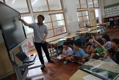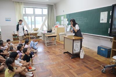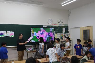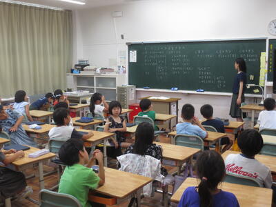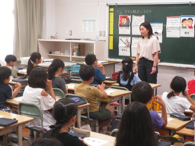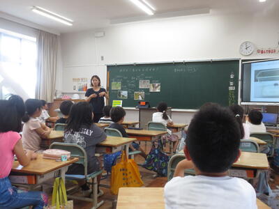 夏休みが終わり、子供たちの元気な声が戻ってきました。1年生の教室では、夏休みの思い出を絵日記を使って、紹介していました。