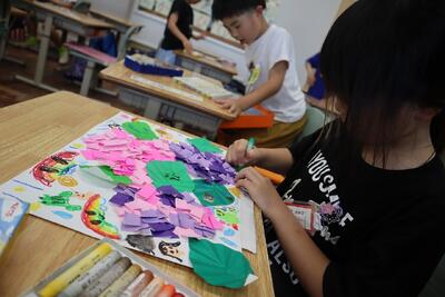 1年生の図工の授業では、チラシをつかって、切ったり、貼り付けたりして、自分だけのはらぺこあおむしを表現しています。みんな夢中で作品づくりに取り組んでいます。すてきな作品ができあがりそうです。