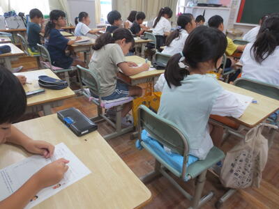 2年生が算数の授業で、「水のかさ」の学習活動を行っています。目を輝かせながら取り組んでいます。ノートにしっかりと良い姿勢で書くことができる2年生、とても立派です。