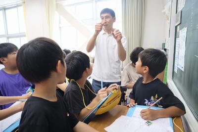 3年生の理科の授業では、子供たちが、楽器の音を出して、音のしくみを調べていました。振動を触って感じて気づきが深まります。
