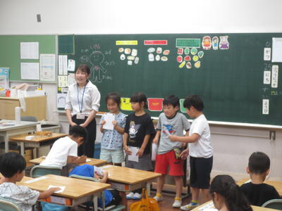 夏休み前最終日、3年生の教室では、学級活動の時間で「なつまつり」を楽しんでいました。手作りのお店を前半と後半に分かれて、お店番とお客さんになり、活動しています。