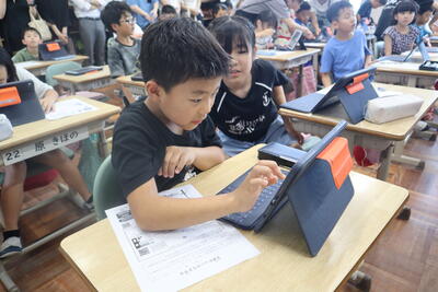 2年生が1年生に学校を案内してくれました。「ここが校長室だよ。校長先生がお仕事しているよ。」とタブレットを見ながら一生懸命説明する姿は、さすがお兄さん・お姉さんの2年生だなと感じました。1年生もとっても楽しそうでした。