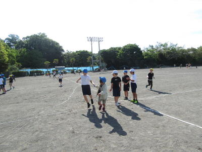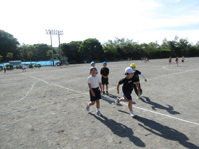 朝の運動場では、4年生のやる気あふれる子たちが、リレーの練習を行っていました。