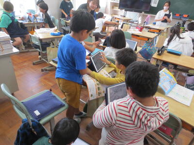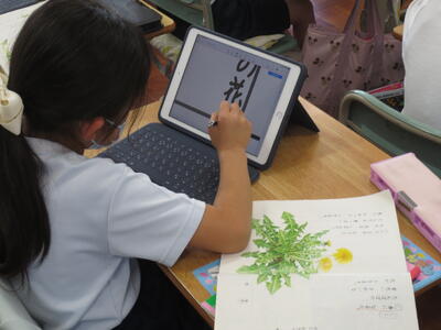 2年生の国語の学習です。タブレットを使ってたんぽぽの知恵についてまとめています。みんなタブレットを文房具のように使いこなし、自分の考えをまとめていました。