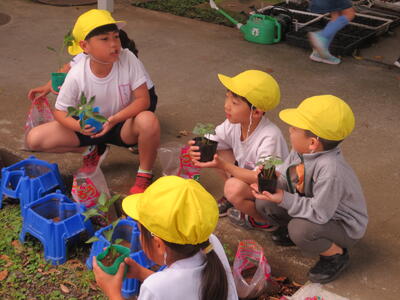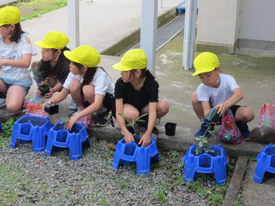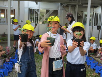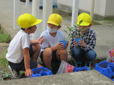 2年生が生活の学習で野菜を育てます。今日はミニトマト、ナス、オクラ、ピーマンなど、自分のお気に入りの野菜の苗を、鉢に植えました。これから毎日世話をして、観察を続けます。夏には立派なみがなることと思います。今から収穫が楽しみですね!