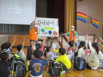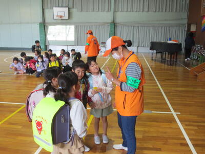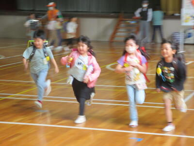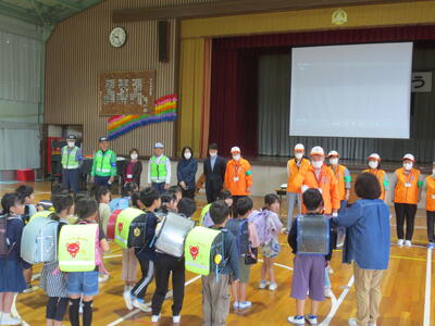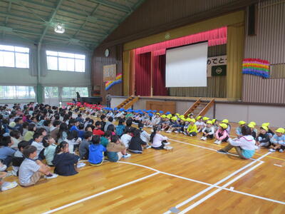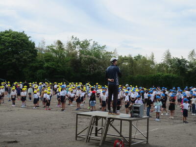 9日(木)の午前中、1年生が防犯教室を行いました。スクールガード、三島警察署、三島市役所、防犯サポーターの方々にお越しいただき、防犯ブザーの使い方やかけこみ110番の家、「いかのおすし」についてお話しいただき、後半は実際に知らない人に声をかけられたときに上手に逃げる練習をしました。みんな大きな声で「たすけてー!」といいながら防犯ブザーを鳴らし、逃げることができました。いざというときにどうすればよいか、ぜひご家庭でも練習しておいてください。