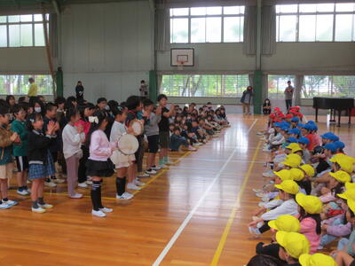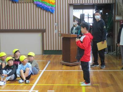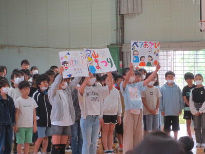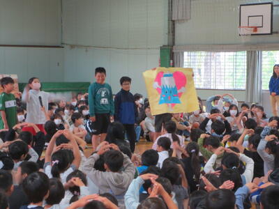 2年生は昨年自分たちが育てたアサガオの種をプレゼント。3年生はかわいい1年生にやさしく呼びかけをしました。4年生は「フレー!フレー!1年生!」と、元気のよいエールを送り、5年生は児童会のキャラクター「むっくん」を紹介してくれました。最後にペア学年の6年生は、運動会や向山まつりなど、学校の楽しい行事を紹介してくれました。