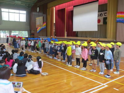 9日(木)の朝、全校で「1年生ようこその会」を行いました。学年ごとに1年生に素敵なプレゼントを贈ります。