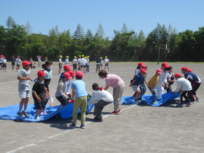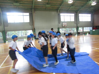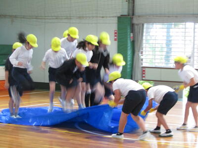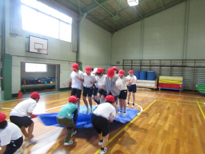 5年生が、運動会の学年種目『とべ!魔法のじゅうたん』を練習に励んでいました。