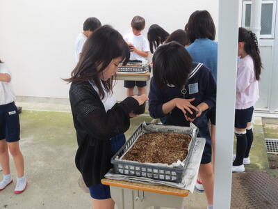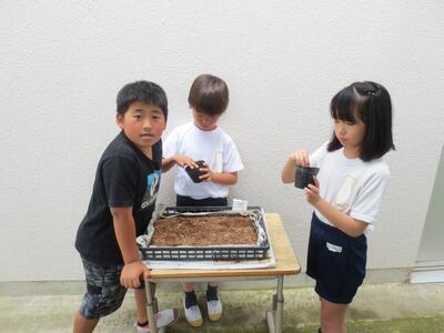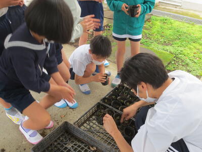 4年生が理科の時間に花をポットに植えていました。発芽したばかりの秋桜です。移植ごてで土ごとていねいにとり、ポットに植えています。花が咲くのが楽しみですね!