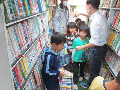 今日の昼休みに、ジンタ号が来ました。たくさんの子が本をじっくり選んで借りていきます。