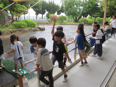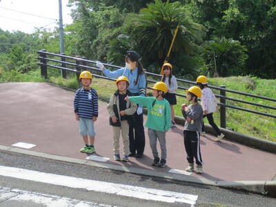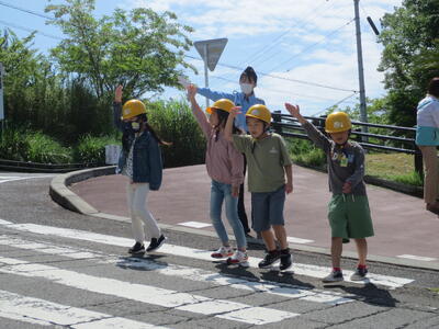 信号が青になってもすぐに渡らず、左右をよく見て、手をあげて渡ります。歩道を歩くときにも駐車場から車が出てこないか、しっかり見てから通ります。みんな上手にできていました。
