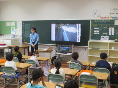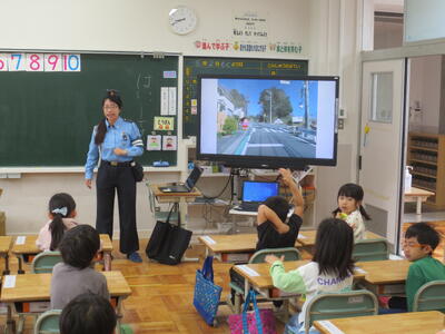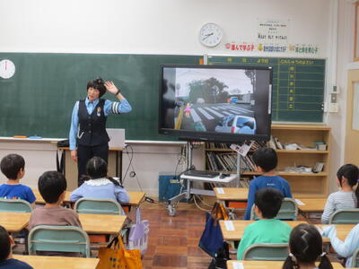 今日の1・2時間目に、1年生が交通安全教室を行いました。教室で指導員さんのお話を聞いた後、実際に信号機のある横断歩道を渡る練習をしました。